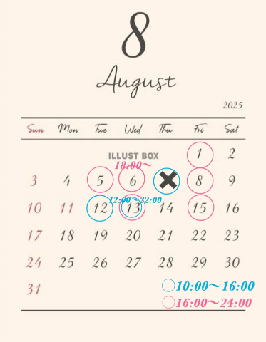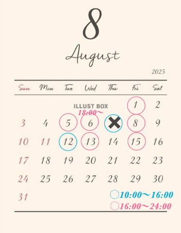 8/13水が、12:00〜22:00です🥰