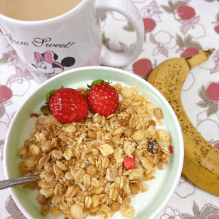 今日はいつもの朝ごはんに、実家からおすそ分けしてもらったいちご🍓をのせてみたの🍴